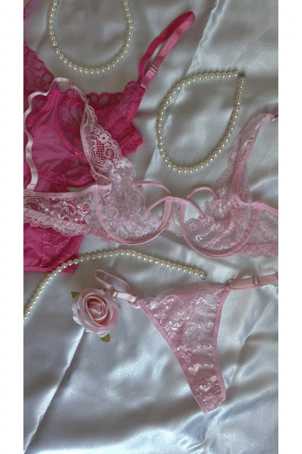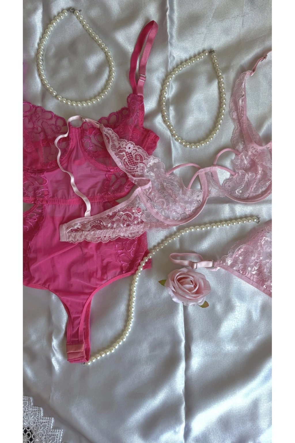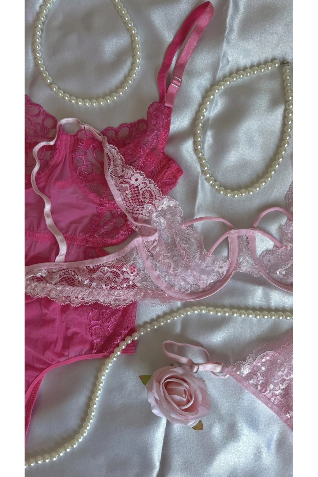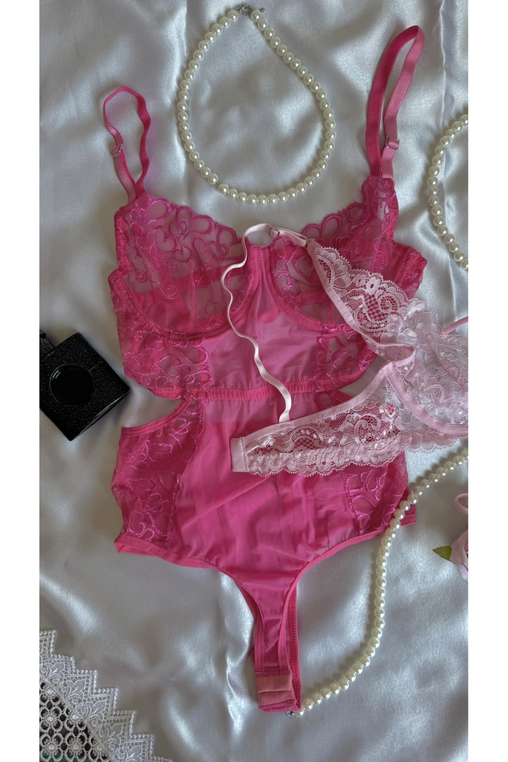 Pembe ve Fuşya Dantel Detaylı Transparan Sütyen & Tanga Seti