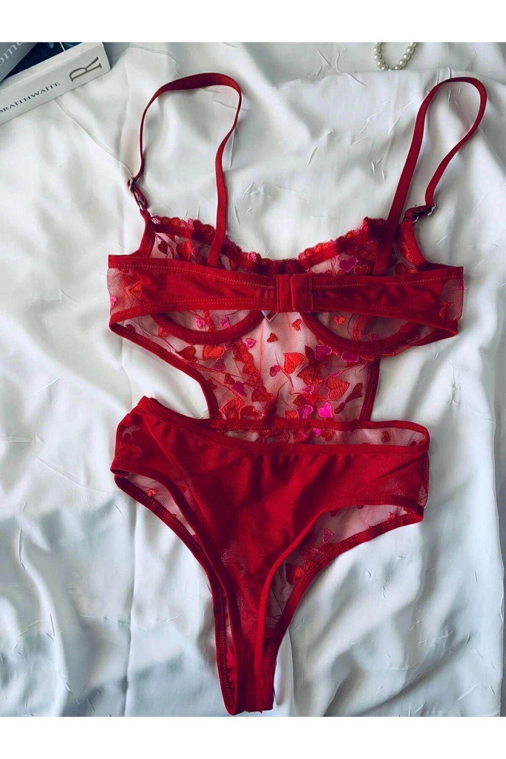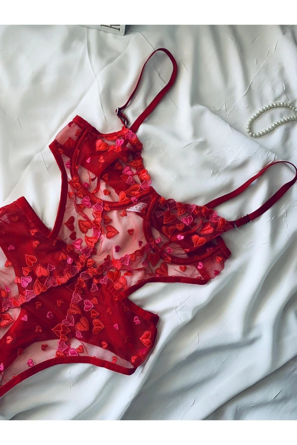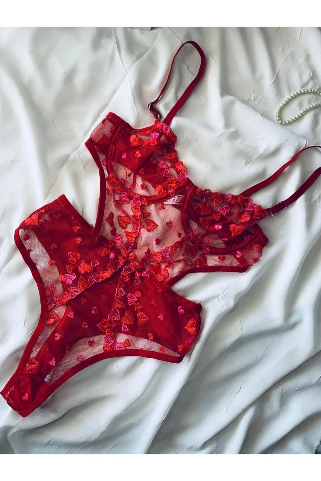 Yılbaşı Hediyesi Kırmızı Kalpli Brode Balenli Kapsız Bodysuit