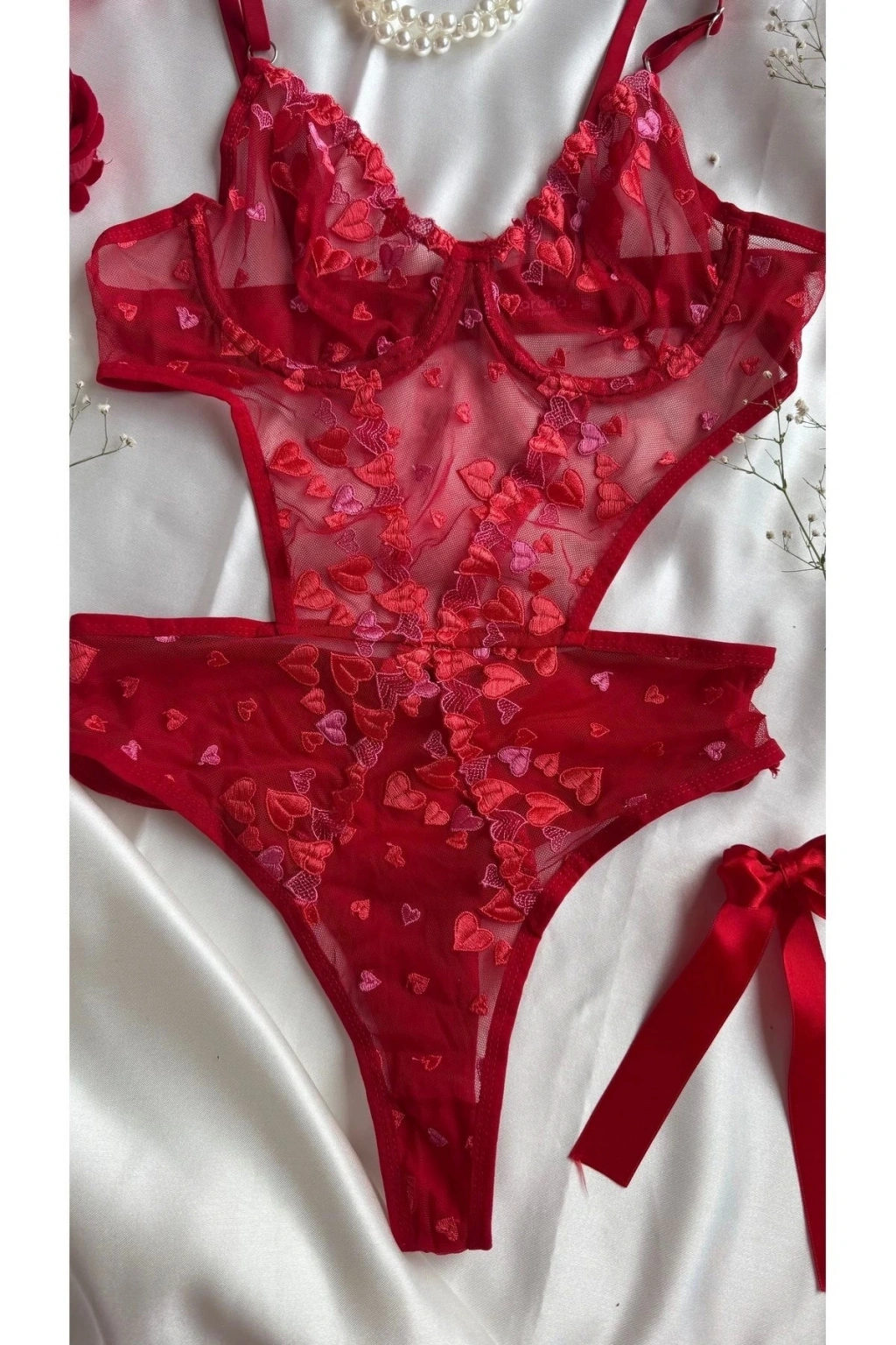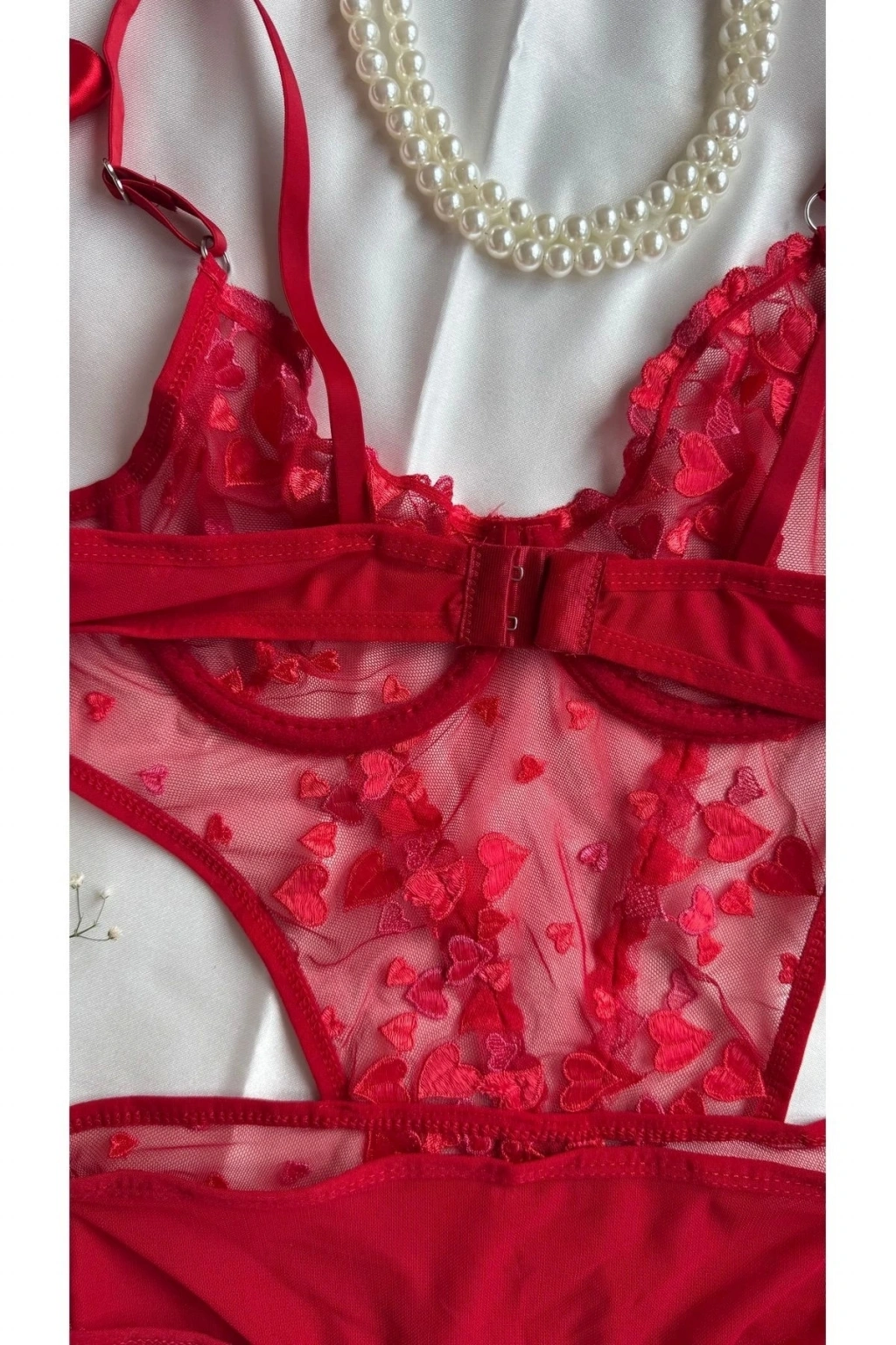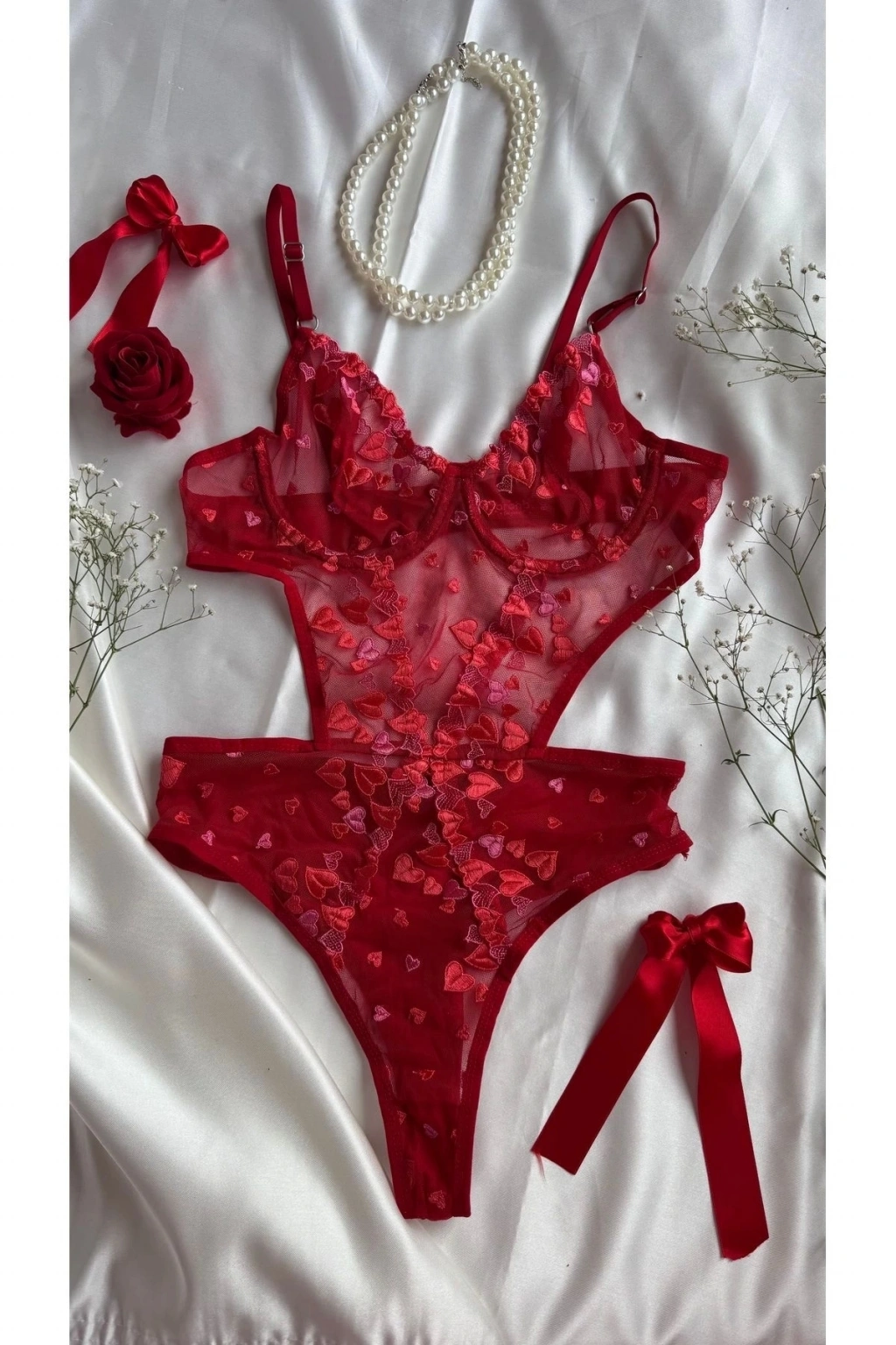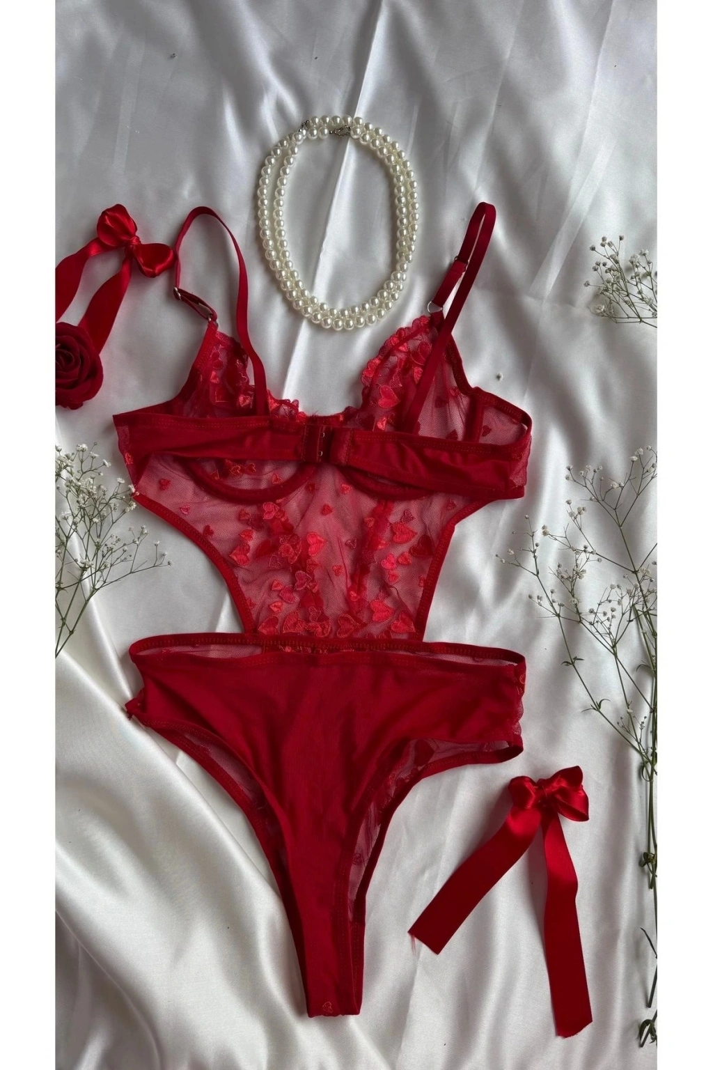 Yılbaşı Hediyesi Sevgililer Günü Özel Kırmızı Kalpli Brode Balenli Kapsız Bodysuit